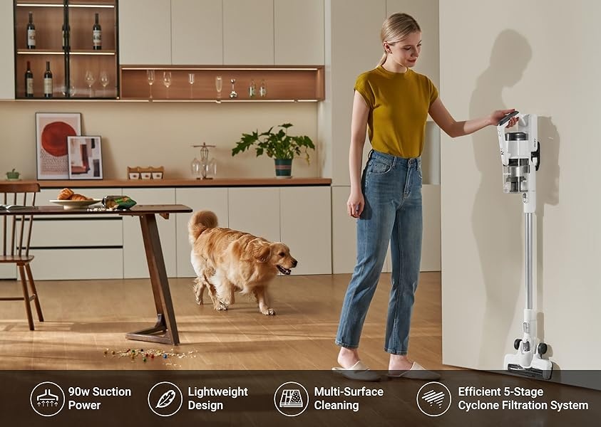 Pet owners with bare floors will appreciate the powerful hair pickup and anti-tangle brush. The whole-machine filtration captures allergens effectively. The versatility of switching between stick and handheld modes adds genuine value.